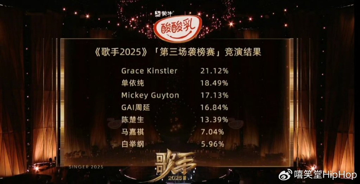 最终,《歌手》第三期的完整排名出炉,Grace Kinstler拿下了全场第一,白举纲被淘汰了。