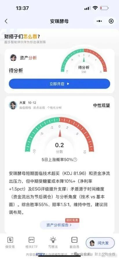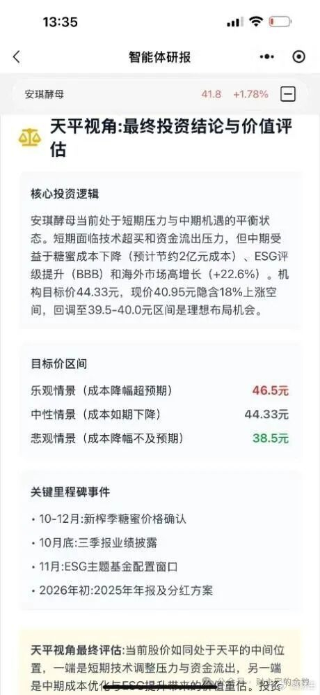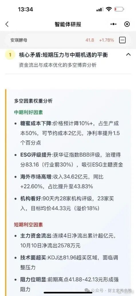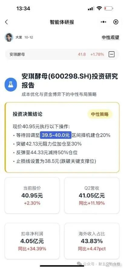 关于安琪酵母这家公司,财搭子的智能体研报是下面这个样子的,结论是“中性观望”