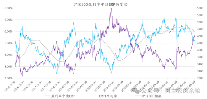 观察过去10年沪深300指数的ERP数据(ERP值越低,意味着股市估值越高)可以看到,沪深300指数的ERP一般在3%-7%之间;但在过去4年时间里,沪深300指数的ERP一般都在5%以上——在10月9日,沪深300的ERP降至5.1%,接近2024年10月8日、2024年4月中旬以及2022年6月中旬。