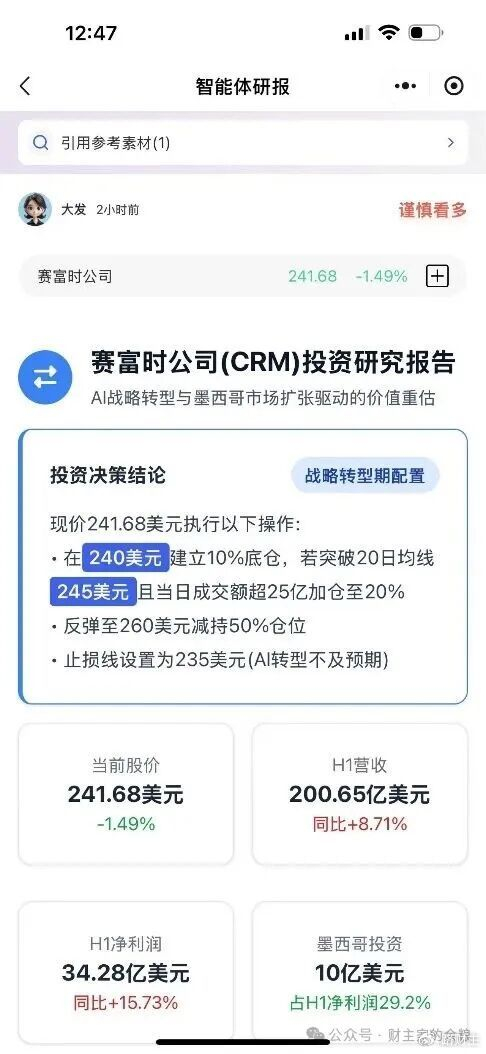 关于赛富时公司,该研报引用了该公司最近几年的财报以及市面上公开的相关分析报告,给我做了一份详细的资产分析报告。资产分析报告包括了整体情况、财务与市场现状、AI战略转型、投资项目评估、风险因素评估、行业风险、投资策略与跟踪等好几个部分,最后还给总结成了一个观点——谨慎看多