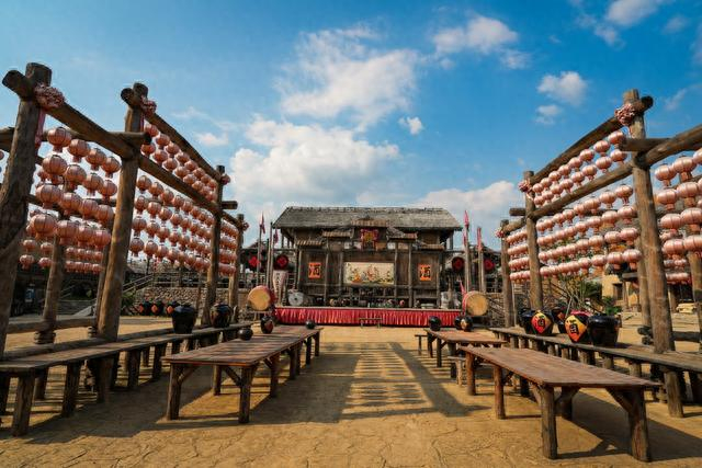 在红高粱影视基地,每天都有《高粱红了》的实景剧演出在占鳌寨进行。