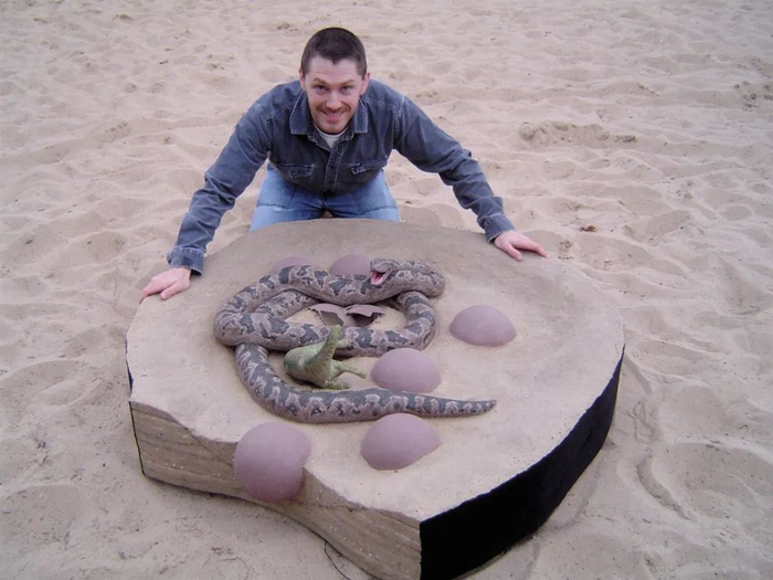 图注:古裂口蛇捕食小恐龙的模型与人类对比,图片来自网络