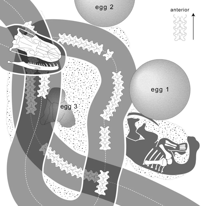 经过修复,化石的全貌终于展现在大家面前,在恐龙蛋和恐龙化石周围竟然盘踞有一条大蛇。古生物学家研究了这具蛇类化石,并于2010年将其命名古裂口蛇,相关研究发表在《公共科学图书馆·生物学》(PLOS Biology)上。