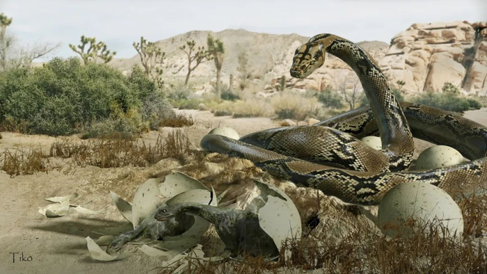 图注:古裂口蛇捕食恐龙宝宝的复原图,作者:儒略·斯托尼