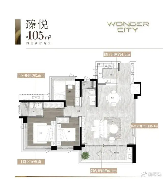 你可能不会想到,就连最小的户型,都能做出标配的约6.1米客厅开间(拓展后)、270°主套环幕景观飘窗、约3.6米主卧开间。
