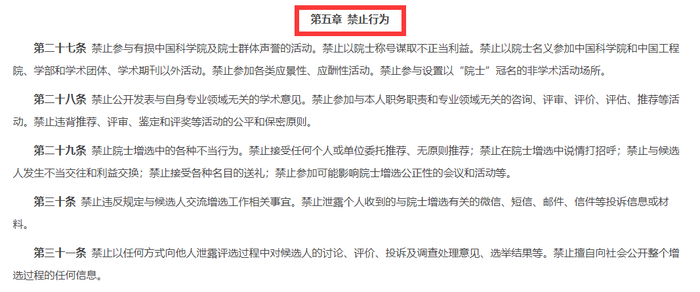 第二十九条禁止院士增选中的各种不当行为。禁止接受任何个人或单位委托推荐、无原则推荐;禁止在院士增选中说情打招呼;禁止与候选人发生不当交往和利益交换;禁止接受各种名目的送礼;禁止参加可能影响院士增选公正性的会议和活动等。