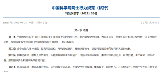 新版具体分为总则、科研活动行为规范、社会活动行为规范、增选工作行为规范、禁止行为和附则共六章。