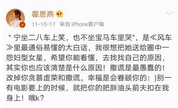 五天后,霍思燕连发三条微博,指名道姓大骂黄奕贪慕虚荣爱撒谎,是个又蠢又贪的怨妇,还说对方每当有新戏上映就给自己泼脏水,把肥胖油头的前夫扣在自己身上。