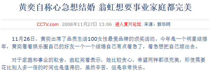 2008年,黄奕在接受采访时,更是有意无意暗示自己想要结婚的打算。
