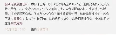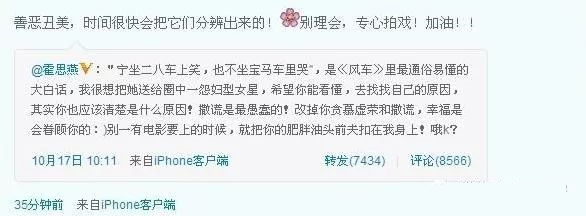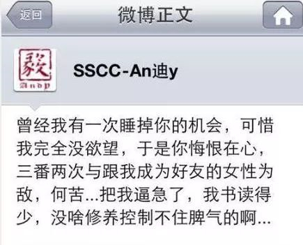 他不仅公开发表“带颜色”的打油诗攻击霍思燕,还不忘在小号自称曾有机会睡霍思燕却很不屑。