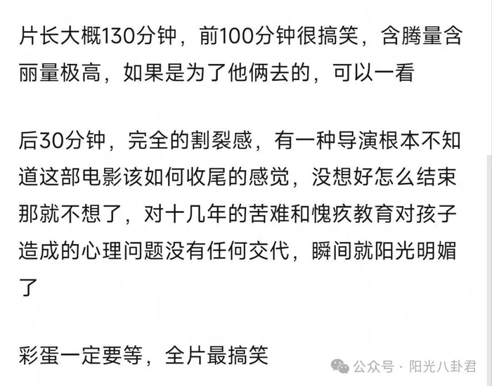 大部分网友对于电影的结局有些不太满意,认为导演在收尾方面并没有进行完美的填坑,促使电影的节奏偏移,有点强行升华的意思。