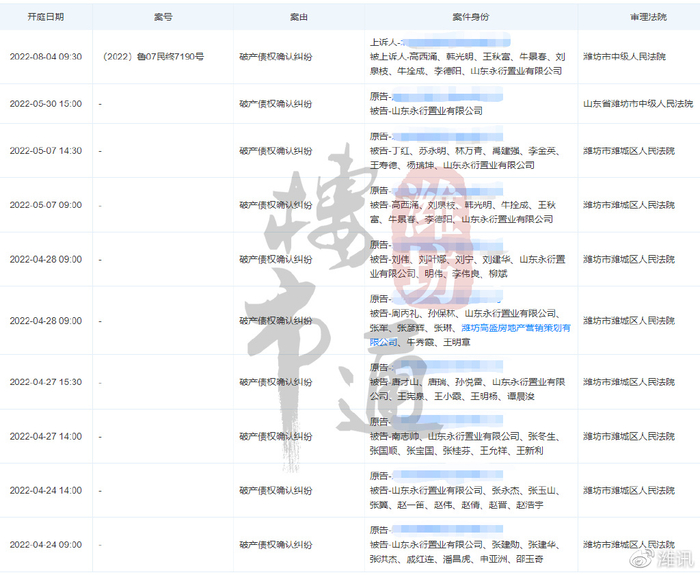 2019年11月14日,潍城区人民法院作出(2019)鲁0702破申1号裁定书,裁定受理对山东永衍置业有限公司的破产重整申请。同时,指定山东骏博律师事务所担任山东永衍置业有限公司破产管理人。次年6月4日,山东骏博律师事务所申请辞去管理人职务。