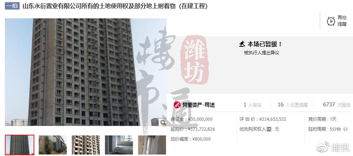 2018年2月12日,潍坊市中级人民法院对该项目的部分土地使用权及部分地上附着物(在建工程)进行拍卖,起拍价17172.2826万元,最终因被执行人提出异议而中止拍卖。