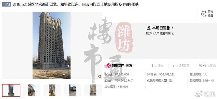 2019年3月22日,潍坊市中级人民法院对该项目部分土地使用权及售楼处进行拍卖,起拍价3954.52547万元,最终因被执行人申请主动履行而暂缓拍卖。