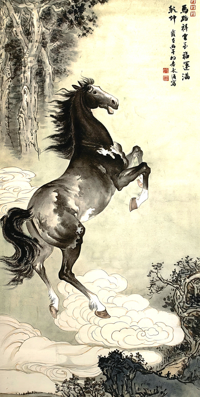 △冯水清《马踏祥云至,福运满乾坤》。1月30日,丹青贺岁骏马呈祥一冯水清中国画作品展在山东潍坊张大功奥林匹克收藏博物馆开幕。(图为展览现场)。
