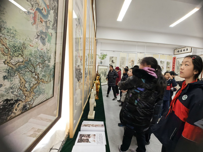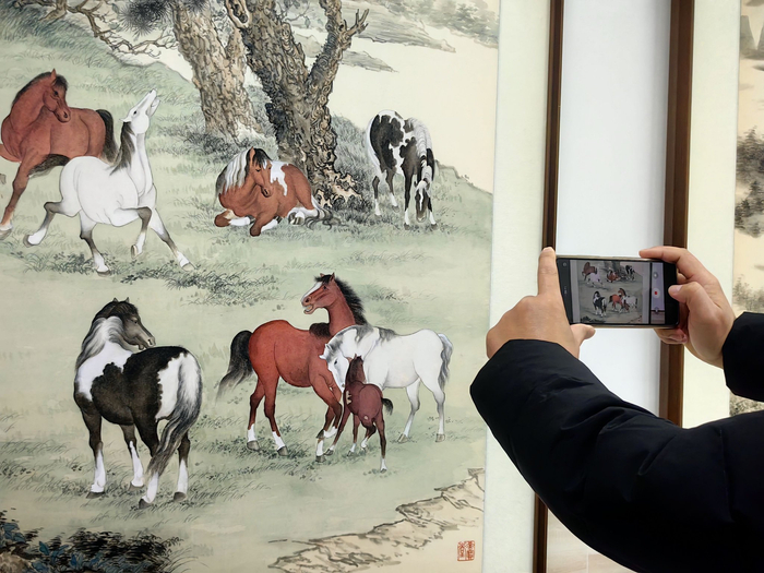 1月30日,参观者在潍坊张大功奥林匹克收藏博物馆“丹青贺岁骏马呈祥一冯水清中国画作品展”上拍摄参展作品。