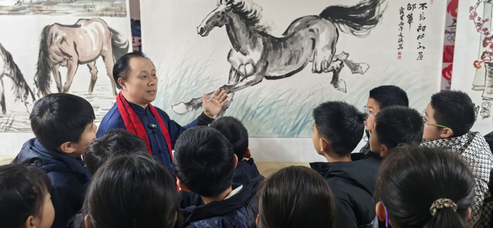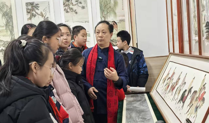 △ 1月30日,丹青贺岁骏马呈祥一冯水清中国画作品展在山东潍坊开幕。张大功在展览现场为观众讲解展品。