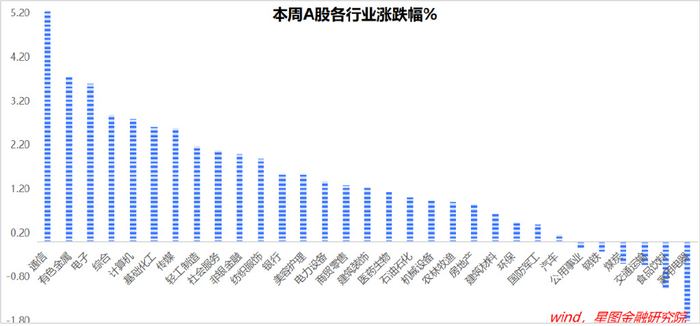 行业层面,通信(5.27%)、有色金属(3.74%)、电子、综合、计算机、基础化工均涨超2.6%;家用电器(-1.79%)、食品饮料(-1.06%)、交通运输、煤炭、钢铁跌幅靠前。