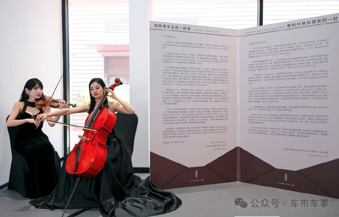 他的目光越过台下人群,直扫展厅中央——大、小提琴演奏员身后两封被放大在KT板上的公开信,一封是他写给林肯车主的,另一封是他致杭州媒体的。