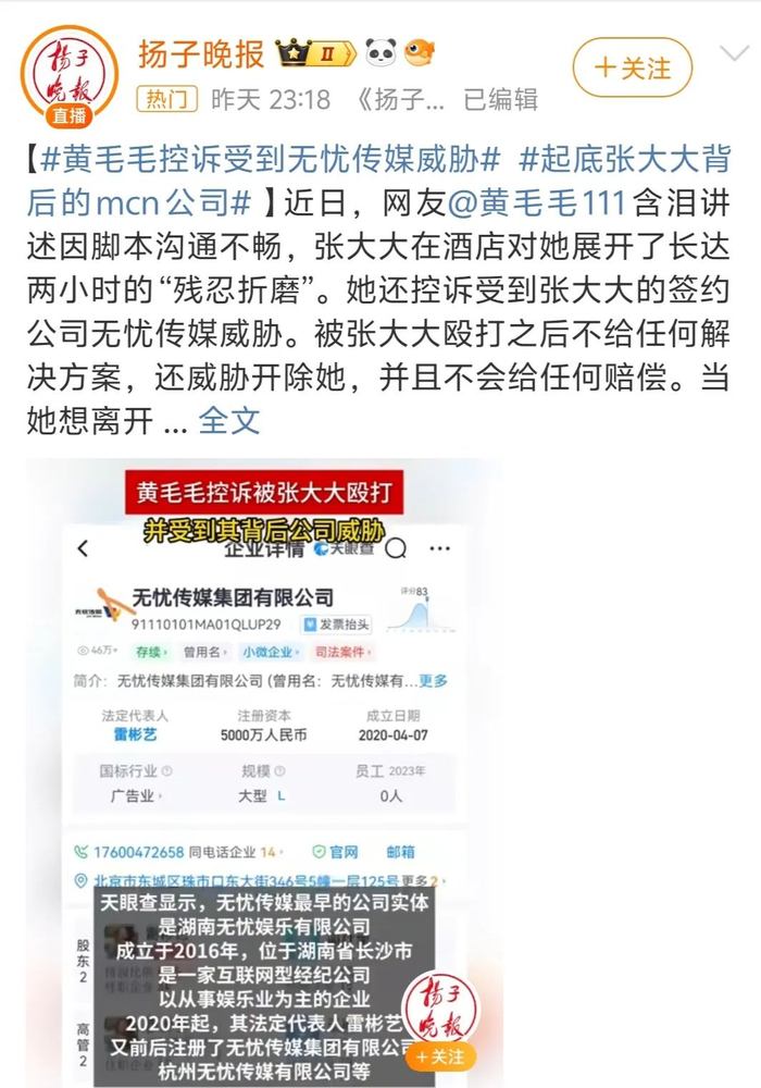 1月25日,距离除夕只剩3天时间,辛苦奋斗了一年的打工人都回到老家或者正在回家的路上,准备开开心心的过年,打工人黄毛毛却陷入了一件糟心事,她在明星张大大手下工作期间,因为修改脚本时意见不和,张大大对她进行了持续的言语侮辱,最后还升级为肢体冲突。
