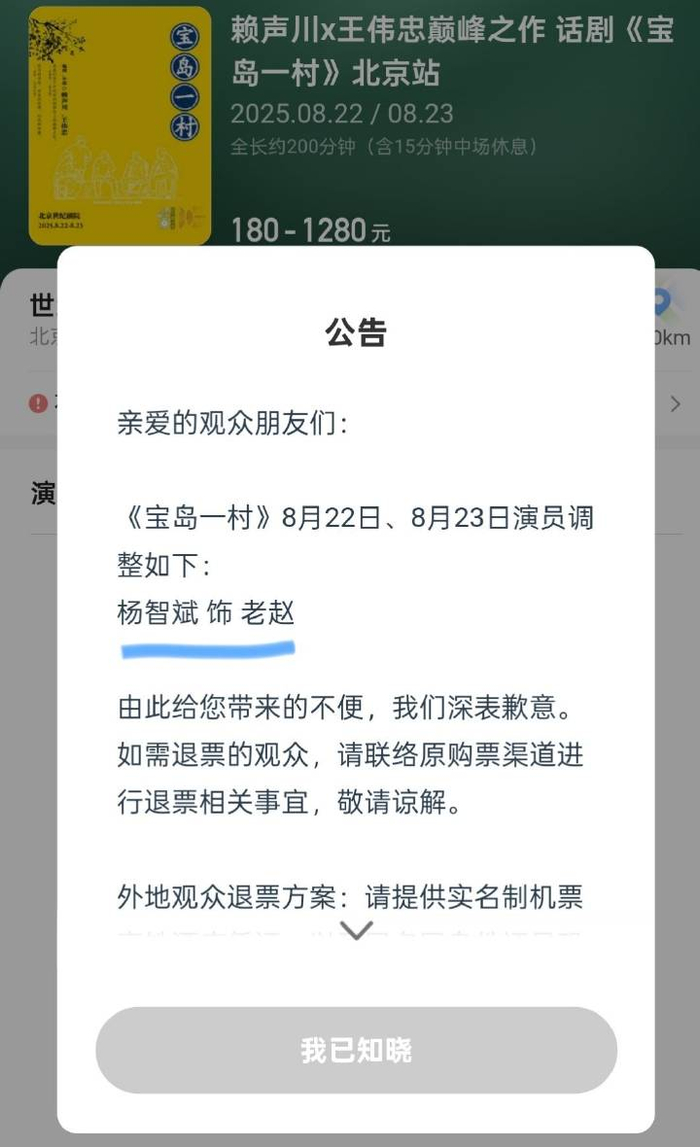 有句台词说得好,出来混迟早是要还的。现在轮到赖声川还了,8月22日,根据票务平台的公示,《宝岛一村》饰演老赵的演员改为杨智斌,替换了涉毒演员屈中恒。