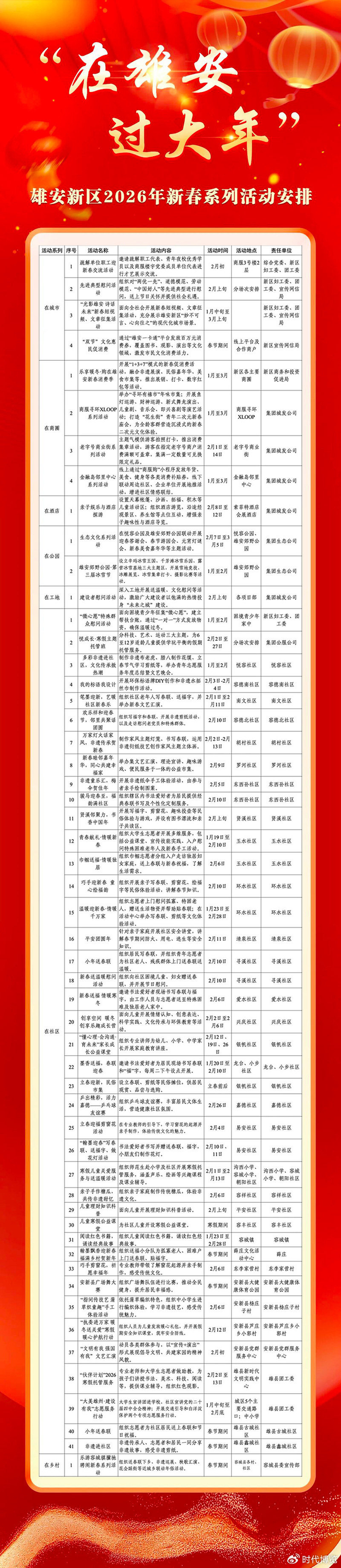 1.在城市,面向疏解家庭举办居民新春联欢晚会、“住在雄安很幸福”故事汇,面向疏解企业职工举办新春联欢会,面向全民举办“光影雄安 诗话未来”新春短视频、文章征集活动,面向机关事业单位举办羽毛球等体育比赛,面向各领域先进典型开展节日慰问活动;