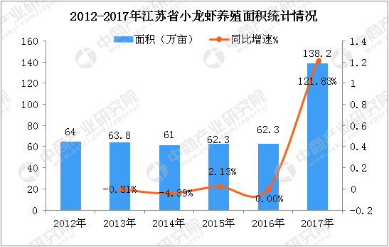 江苏省作为中国前五大小龙虾大省,小龙虾产业一直保持较快较好发展。据统计,2017年江苏省小龙虾养殖面积138.2万亩,比2016年同期养殖面积增加了75.9万亩,同比增长121.83%。数据显示,2012-2016年江苏省小龙虾养殖面积稳步增长,基本保持在62万亩左右,2017年养殖面积增加了一倍有余。
