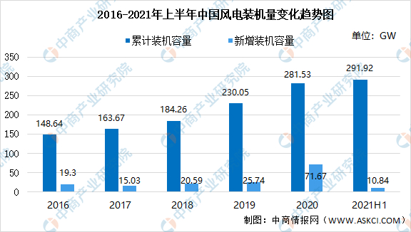 2020年,是我国风能行业获得爆发性增长的一年,我国风电新增并网装机容量达71.7GW,风电累计装机容量达281.53GW。2021年上半年我国风电新增并网装机容量达10.84GW,风电累计装机容量达291.92GW。