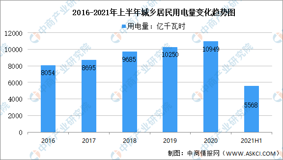 2021年上半年,城乡居民生活用电量5568亿千瓦时,同比增长4.5%,两年平均增长5.6%。一、二季度,城乡居民生活用电量同比分别增长4.7%和4.2%,两年平均增速分别为3.9%、7.9%。上半年,城镇居民生活用电量同比增长6.0%,两年平均增长4.9%;乡村居民生活用电量同比增长2.6%,两年平均增长6.5%。