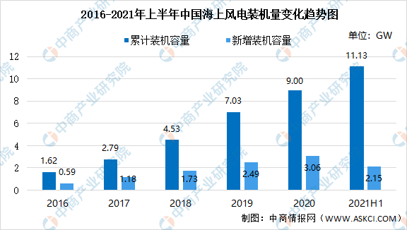 数据显示,2020年我国海上风电新增并网装机容量达3.06GW,海上风电累计装机容量达9.00GW。2021年上半年我国海上风电新增并网装机容量达2.15GW,海上风电累计装机容量达11.13GW。