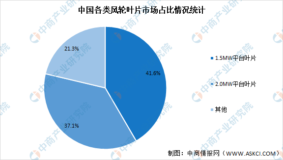 风轮是指将风能转化为机械能的风力机部件,由叶片和轮毂组成。叶片是风电部件中确定性较高、市场容量较大、盈利模式清晰的行业。目前,我国风力发电机叶片主要有1.5MW平台叶片、2.0MW平台叶片、其他功率平台叶片等系列产品。其中,1.5MW平台叶片在市场上占比较高,达41.6%,主要是在额定功率1.5MW的风力发电机平台上使用的,而2.0MW平台叶片在累计装机容量中占比为37.1%。