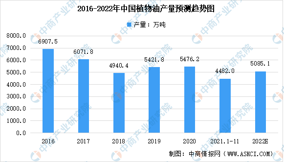 由于植物油产地、来源、精炼方式、脱臭过程中的工艺条件等均有差异,因此其脱臭馏出物的产量亦不同,一般占油脂总量的0.3%-0.6%。根据中国统计年鉴和国家粮油信息中心统计数据,2020年我国主要的植物油产量达到了5776.2万吨,2021年1-11月主要的植物油产量达4482万吨,并预计2022年我国植物油将达5085.1万吨。