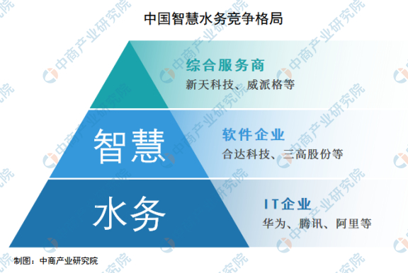 目前,中国智慧水务行业的企业主要分为综合服务商、软件企业以及大型IT企业。其中,综合服务商代表企业有新天科技、威派格等;软件代表企业有合达科技、三高股份等;大型IT企业有华为、腾讯、阿里等。