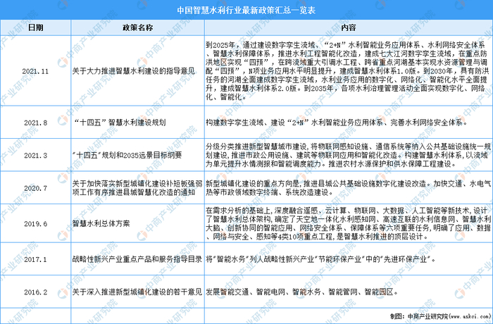 中商情报网讯:近年来,国务院、国家发改委、住房城乡建设部等多部门都陆续印发了支持智慧水利行业的发展政策。2021年水利部编制《“十四五”智慧水利建设规划》,建设数字孪生流域、“2+N”水利智能业务应用体系、安全可控水利网络安全防护体系、优化健全水利网信保障体系,建成七大江河数字孪生流域,推进水利工程智能化改造,在重点防洪地区实现“四预”,在跨流域重大引调水工程、跨省重点河湖基本实现水资源管理与调配“四预”,推进N项业务应用建设,建成智慧水利体系1.0版。