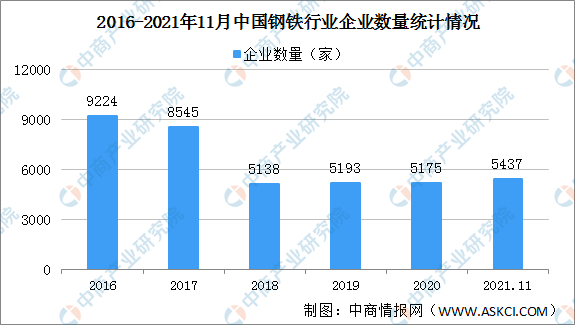 中商情报网讯:中国钢铁行业企业数较多。截至2020年12月末,我国钢铁行业规模以上企业达5173家,与上年相比下降18家。2021年钢铁行业规模以上企业5437家,较2020年有所增加。