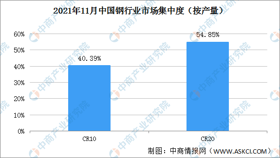 近年来,钢铁行业集中度进一步提升。中钢协公布的数据显示,2021年11月,钢产量排名前10位、前20位的企业钢产量占全国的比重分别为40.39%、54.85%,分别比2020年同期提高2.99个百分点、3.26个百分点。