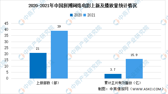 2021年多平台拼播的发行模式取得了亮眼的市场表现,拼播网络电影数量39部,同比增加18部,累计正片有效播放同比上涨3倍。拼播影片的部均正片有效播放4081万,同比提升1.3倍,高于新片均值。