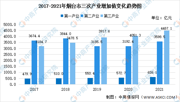 根据市级生产总值统一核算结果,2021年全年烟台市生产总值为8711.75亿元,同比增长8.0%,两年平均增长5.8%。其中,第一产业增加值为626.14亿元,同比增长7.5%,两年平均增长4.9%;第二产业增加值为3598.50亿元,同比增长6.7%,两年平均增长5.6%;第三产业增加值为4487.11亿元,同比增长9.0%,两年平均增长5.8%。三次产业结构调整为7.2:41.3:51.5。