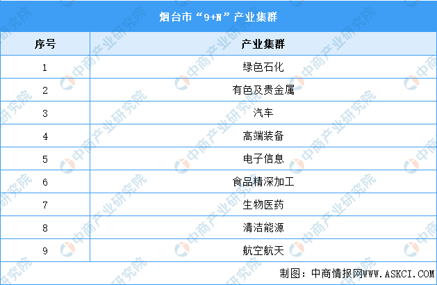 目前,烟台市聚焦绿色石化、有色及贵金属、汽车、高端装备、电子信息、食品精深加工、生物医药、清洁能源、航空航天等“9+N”产业集群,并规划到2023年,培育形成2个2000亿级、4个千亿级和3个百亿级产业集群。