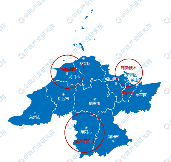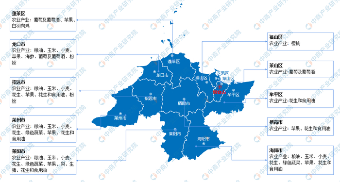 “三区”为高效粮油产业发展区、特色农业发展区及都市农业发展区。高效粮油产业发展区。包括莱州市、莱阳市、海阳市、招远市及龙口市。特色农业发展区。包括栖霞市、蓬莱区、福山区、牟平区及昆嵛区。都市农业发展区。包括开发区、芝罘区、莱山区、高新区。
