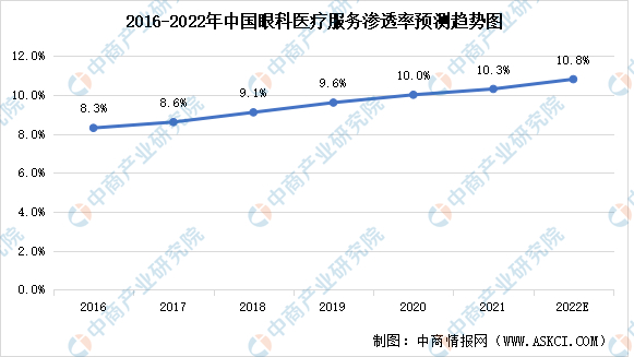 尽管中国眼科医疗服务的渗透率历来低于发达国家,但近年来已逐渐增长。中国眼科医疗服务的渗透率由2016年的8.3%稳步增长至2019年的9.6%,且预计2022年将达10.8%。
