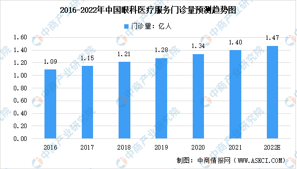 寒假期间,近视防控门诊上,学生的看诊量一般是往常的三倍,青少年近视防控依然严峻。数据显示,2019年我国眼科医疗服务门诊量达1.28亿人,并预计2022年继续上升趋势,门诊量将达1.47亿人。
