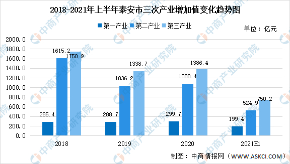 2021年上半年泰安市实现地区生产总值1474.5亿元,同比增长10.7%,两年平均增长5.3%。其中,第一产业增加值为199.4亿元,同比增长6.9%,两年平均增长3.6%;第二产业增加值为524.9亿元,同比增长9.4%,两年平均增长4.5%;第三产业增加值为750.2亿元,同比增长12.7%,两年平均增长6.5%。