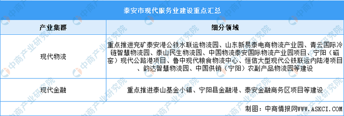 同时,泰安市将重点发展现代物流、商务服务、高端会展、金融服务及检验检测服务。具体现代服务业建设重点如下表所示: