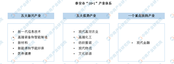 《泰安市新旧动能转换重大工程实施规划》(下称《规划》)中确定了泰安市新旧动能转换十大支撑产业,《规划》确定十大支撑产业即新一代信息技术、高端装备和智能制造、新材料、新能源和节能环保、医养健康五大新兴产业;现代高效农业、高端化工、纺织服装、现代物流、文化旅游五大优势产业。同时,将现代金融产业列入“10+1”产业发展规划重点扶持。