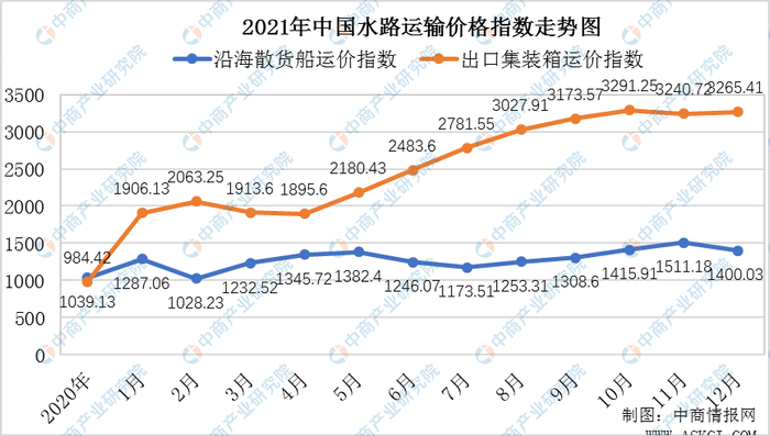 水运方面,海运市场供不应求,价格普遍高于上年,全年各月均位于较高水平。2021年中国沿海散货运价指数平均为1299.35点,同比增长25%;中国出口集装箱运价指数平均为2615.54点,同比增长165.7%。