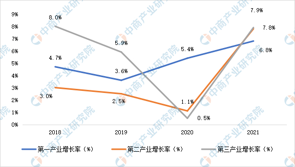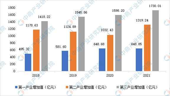 2021年,茂名市地区生产总值为3698.10亿元,同比增长7.6%。其中,第一产业增加值为648.85亿元,同比增长6.8%;第二产业增加值为1319.24亿元,同比增长7.8%;第三产业增加值为1730.01亿元,同比增长7.9%。