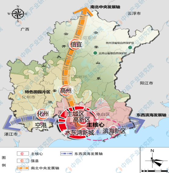“一主”包括茂南区、电白区和三个经济功能区,进一步深化改革创新、推动要素流动、拓展战略纵深、壮大规模总量、强化辐射带动,做大做强主要核心区。“三副”由高州、化州、信宜三个产业发展强县组成,注重推动城市更新高质量发展,培育壮大具有鲜明地域特色的创新型现代产业体系。“两轴”是坚持把城市产业发展重点布局在南北中央发展轴和东西滨海发展轴这两条城市发展轴上。南北中央发展轴以茂名大道为主线,进一步拓展完善交通网络,强化周边产业平台和产业项目建设,推动产业集聚发展。由南往北错落布局有茂名石化港、电白的小良工业园和反哺工业园、茂名乙烯厂、茂名高新区、茂南的石化工业园、南方国际汽车产业园和中高高岭土产业园、高州的金山工业园和城东工业园以及信宜产业转移工业园等重点园区。东西滨海发展轴沿城市绵长海岸线布局,从东到西依次是工业岸线(吉达港区)、港口岸线(莲头半岛段)、居住岸线(电城镇、博贺湾新城段)、渔业岸线(博贺渔港周边)、文旅康养岸线(博贺半岛段)、旅居岸线(环水东湾段)。
