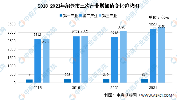 中商情报网讯:绍兴市是浙江省辖地级市,位于浙江省中北部、杭州湾南岸,是具有江南水乡特色的文化和生态旅游城市。东连宁波市,南临台州市和金华市,西接杭州市,北隔钱塘江与绍兴市相望。绍兴已有2500多年建城史,是首批国家历史文化名城、联合国人居奖城市,中国优秀旅游城市,国家森林城市,中国民营经济最具活力城市,也是著名的水乡、桥乡、酒乡、书法之乡、名士之乡,绍兴素称“文物之邦、鱼米之乡”。2021年全市生产总值(GDP)6795亿元,按可比价格计算,比上年增长8.7%;与2019年相比,两年平均增长6.0%。三次产业结构由上年的3.7:45.4:50.9调整为3.3:47.5:49.2。