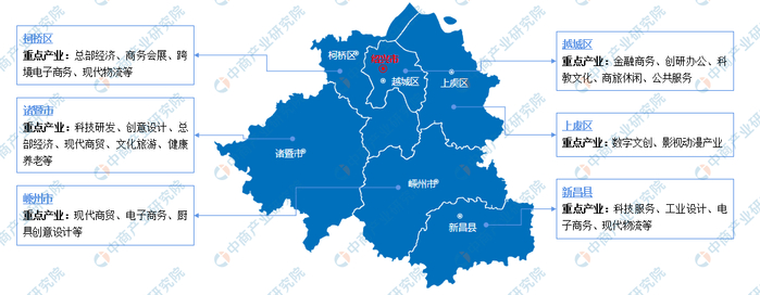 绍兴市辖3个市辖区、2个县级市、1个县。包括越城区、柯桥区、上虞区、诸暨市、嵊州市、新昌县。高端装备、电子信息、现代医药、新材料,是绍兴主抓的四大新兴产业,其中一些,与绍兴重点传统产业的创新升级密切相关。